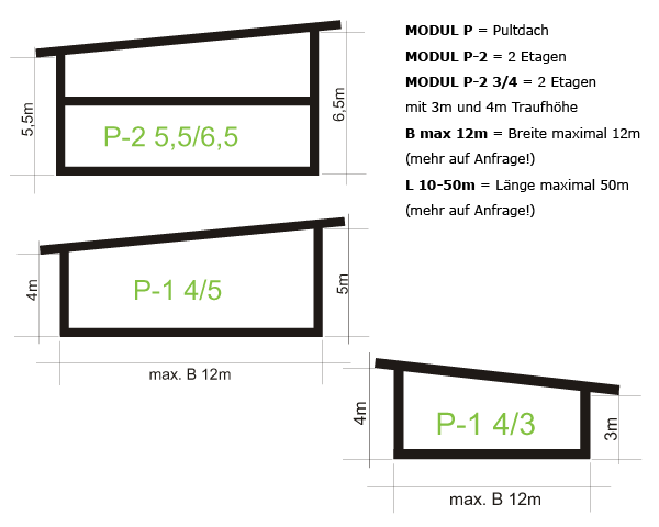 Mit der Modul-Halle ist alles möglich: kombinieren und erweitern Sie nach Ihrem Bedarf. Gestalten Sie Ihren Gewerbebau nach Ihren Vorstellungen. Grundriss, Verglasung, Fenster, Türen, Toren etc.